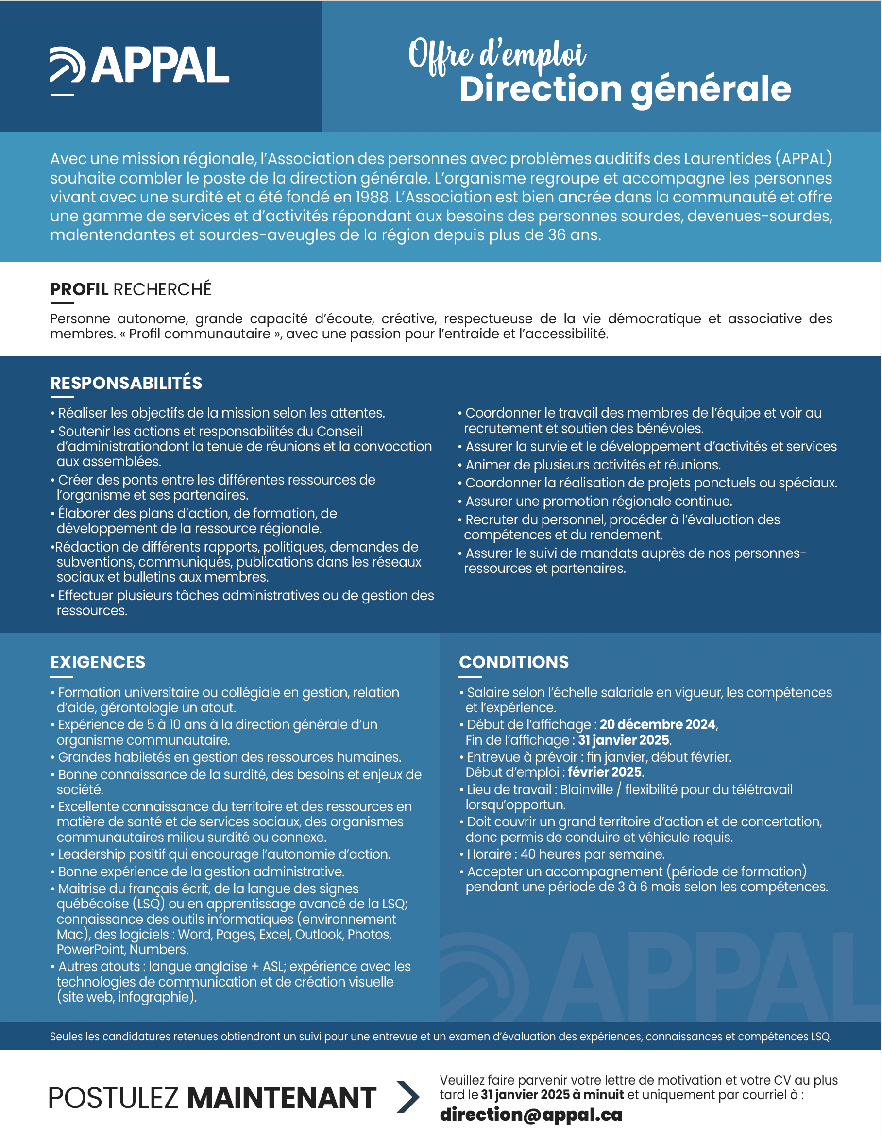 162025Jan 0 APPAL – Direction générale By CCA / CommentsOff Temps plein Blainville / Télétravail Publié il y a 1 an Les candidatures sont actuellement fermées. Site Association des personnes avec problèmes auditifs des Laurentides Offre d’emploi – Direction générale